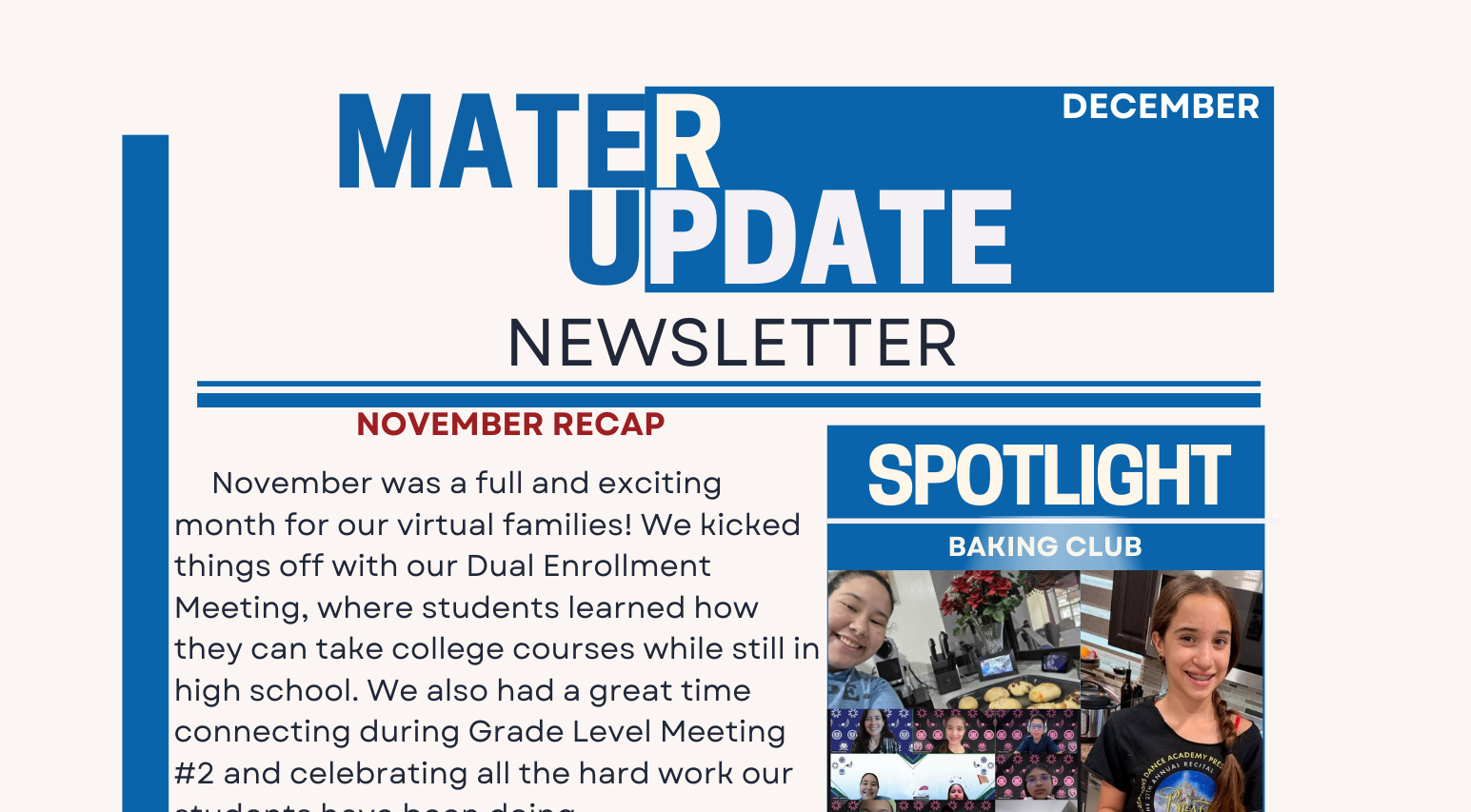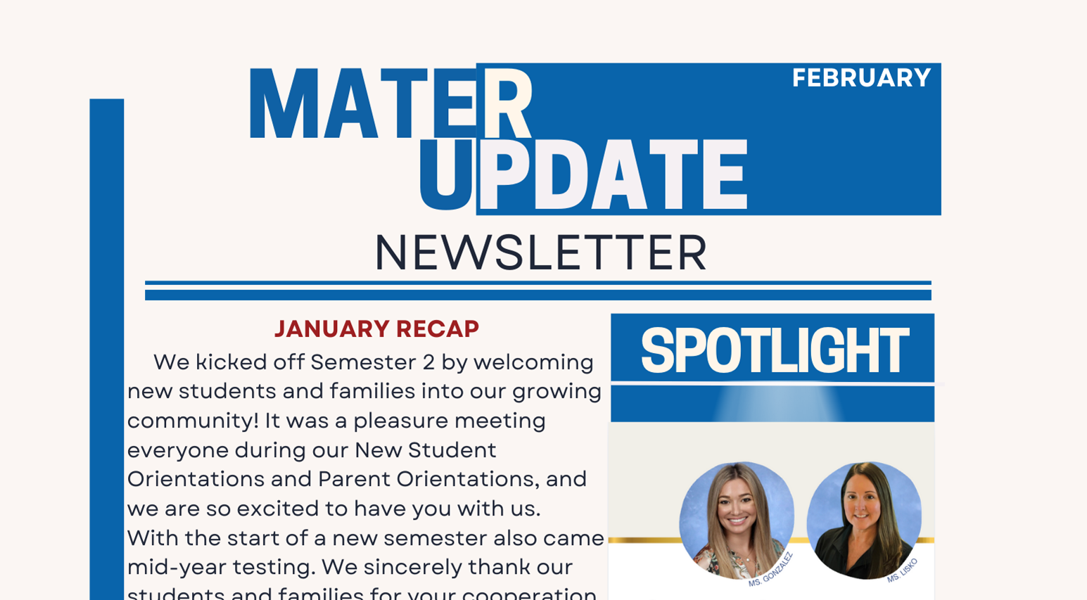 Welcome to Mater Virtual Academy Middle High School. We are a school that encourages the extraordinary in its students; a school that provides the core academic building blocks essential for success beyond high school; a school that provides critical life learning; a school that fosters smart intellectual risk taking in a safe, tailored learning environment. We prepare students beyond what they can achieve in traditional schools by providing an individualized education attuned to their own needs and goals through regular support of nurturing teachers and college counselors. Our intent is to provide an educational experience that encourages our students to build upon their strengths.